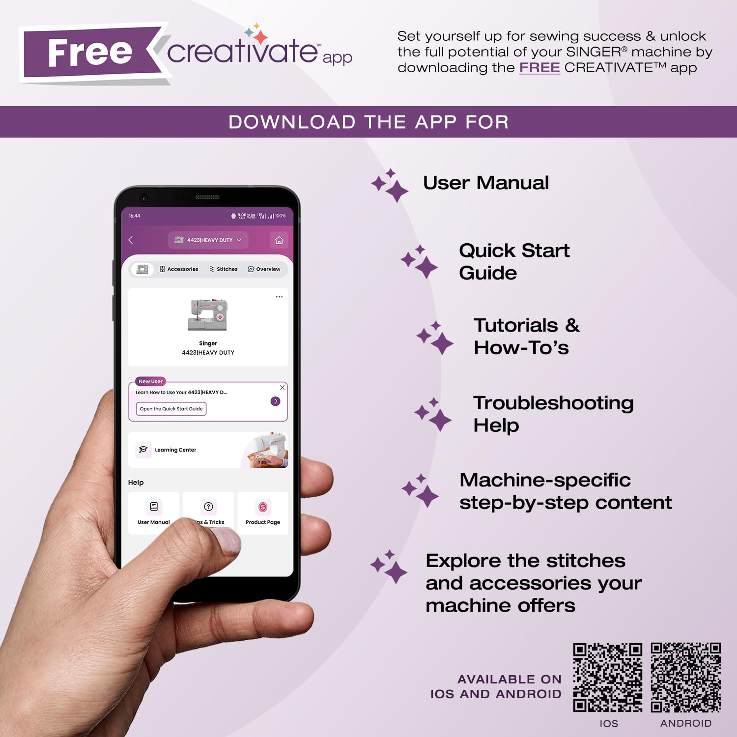 - FREE CREATIVATE App – Your sewing support hub for SINGER! Input your machine model number to access your manual, quick start, tutorials, troubleshooting tips, accessories and more! Download, pick your model & start sewing smarter.