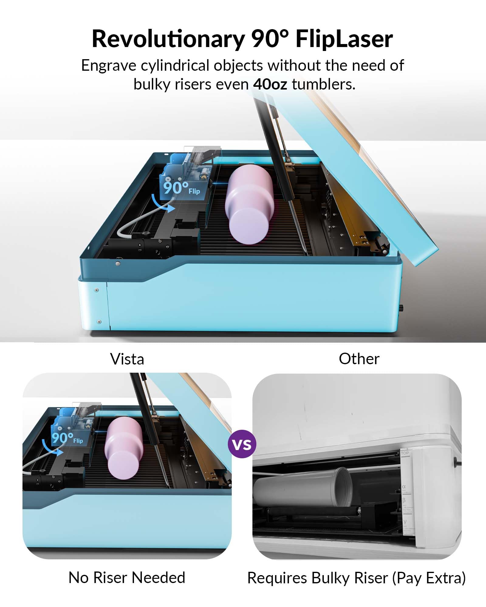 - [Revolutionary FlipLaser, Still the Easiest Rotary]—Vista's patented 90° FlipLaser effortlessly and accurately engraves on 40oz Stanley on your desktop by rotary attachment, without cumbersome manual calibration or bulky risers, it’s perfect for engraving tumblers, mugs, and cups.