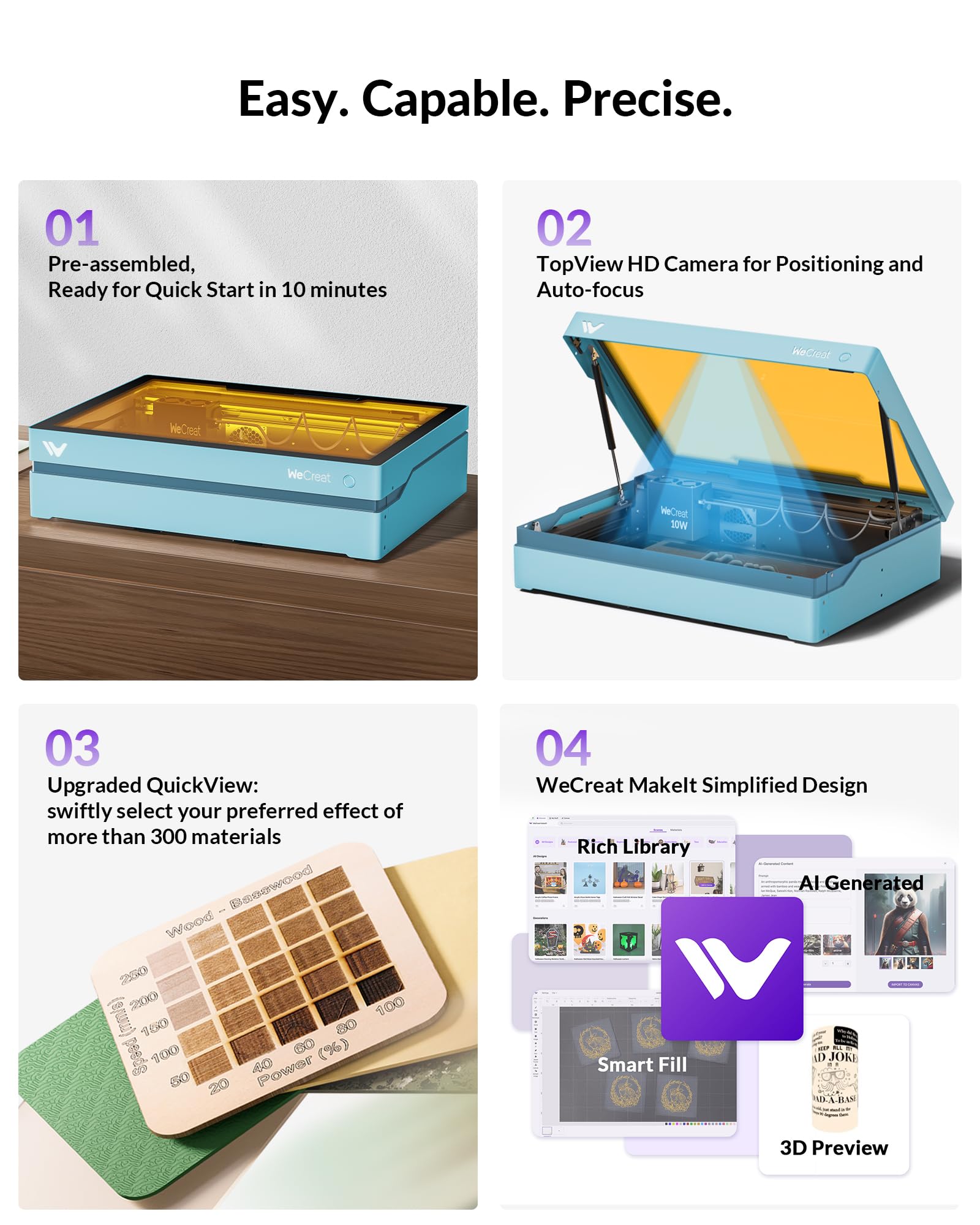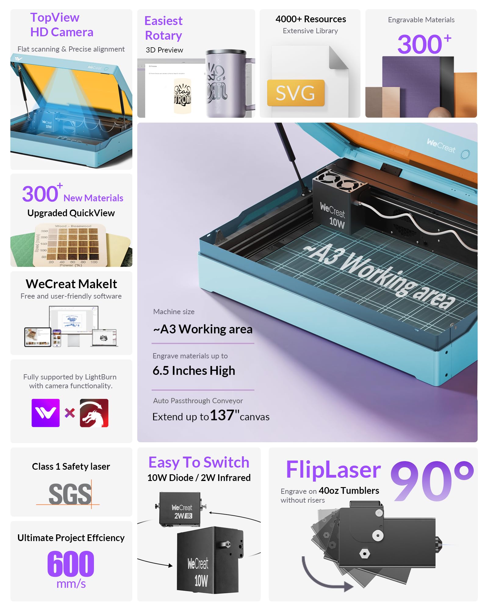 - [WeCreat MakeIt's New Look & Extensive Library]—Experience the best of both worlds – full compatibility with LightBurn plus an updated WeCreat MakeIt library packed with over 2000+ design projects, 500+ typefaces, thousands of SVG images, and weekly new additions. From Valentine's Day to weddings, Halloween to Christmas, the only limit is your imagination. Create custom gifts, earrings, art pieces, or even architectural designs – the Vista is your ticket to endless creativity.
